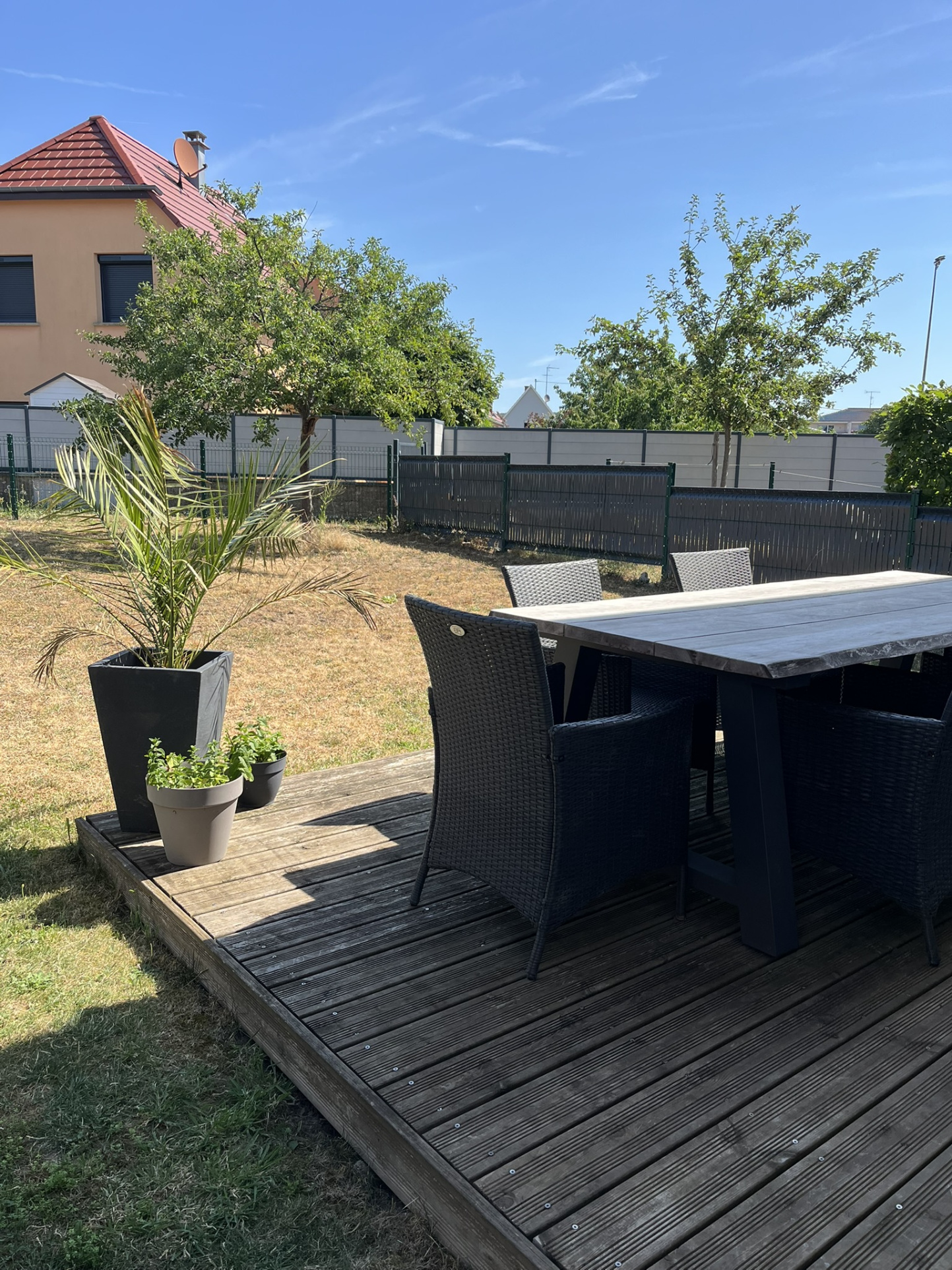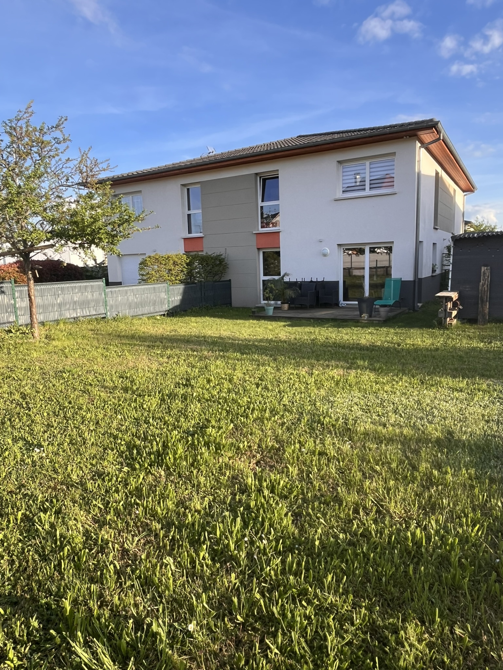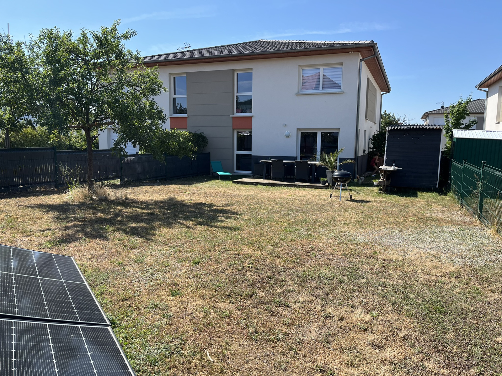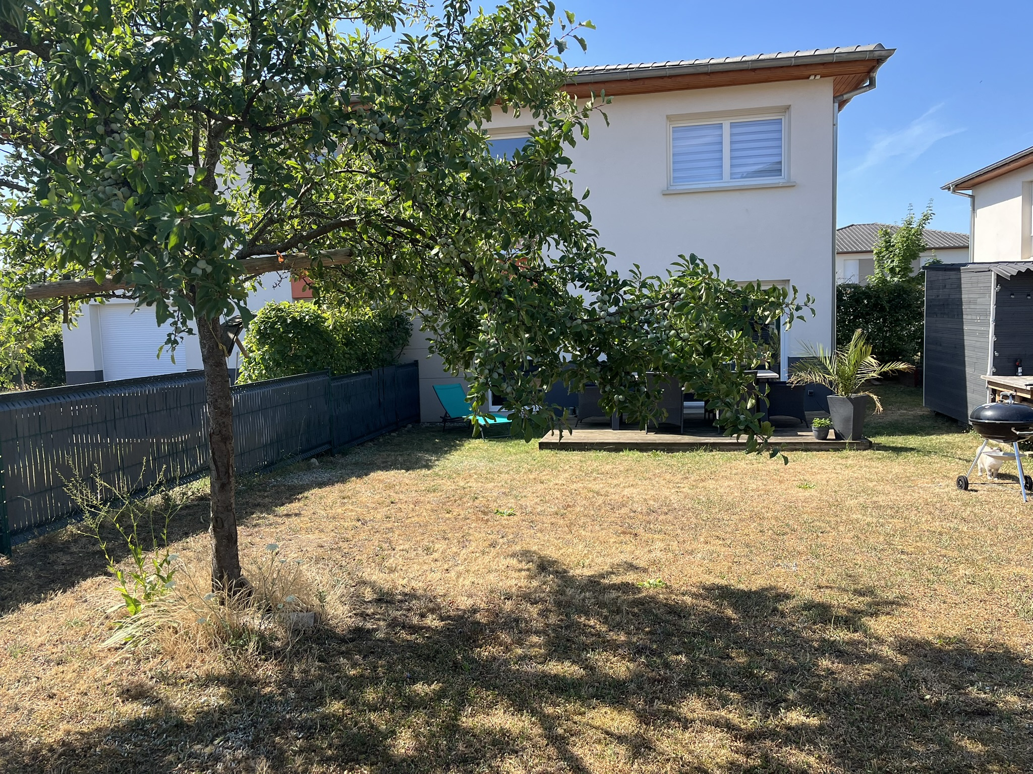 À l’extérieur, vous profiterez d’une agréable terrasse aménagée de 11 m², ouverte sur un jardin privatif de 164 m², engazonné, arboré et entièrement clôturé.